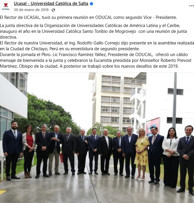 La publicación data cuando Gallo Cornejo tuvo su primera reunión como segundo vicepresidente de la Organización de Universidades Católicas de América Latina y el Caribe (ODUCAL). Fue, junto al resto de la junta directiva, parte de la inauguración anual en la Universidad Católica Santo Toribio de Mogrovejo.
