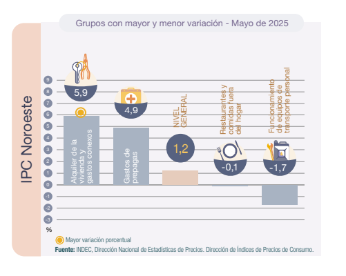 Según el informe publicado este jueves, tanto en el noreste como en el noroeste la mayor incidencia se registró en Alimentos y bebidas no alcohólicas (0,5%). En cuanto a las variaciones en el IPC Noroeste, los aspectos que más incidieron fueron el Alquiler de la vivienda y gastos conexos (5,9%) y los gastos de prepagas (4,9).