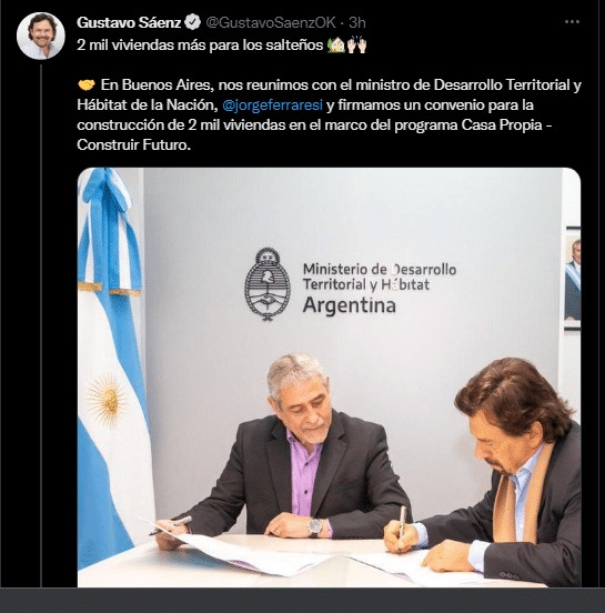 De esta manera, más salteños podrán cumplir el sueño de acceder a la casa propia. Trasa la firma del acta de compromiso del gobernador Sáenz con el ministro Ferraresi se asegura la construcción de 2.000 hogares nuevos. Según lo informado por el gobernador estas se distribuirán con un criterio federal y será construida por el Instituto Provincial de la Vivienda. El convenio es bajo el programa Casa Propia – Construir Futuro.