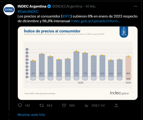 «Venimos en noviembre con un 4,9%, diciembre un 5,1% y ahora en enero 6%. En principio se buscó bajarla de alguna manera, pero lamentablemente no se pudo. Incluso para febrero ya estamos hablando de cifras superiores, entre 6% y 7% mensual», empezó analizando. Las consecuencias de estas para Moreno es que «obviamente peligra gravemente la política económica anunciada por Massa, así que, no es de las mejores noticias. No son nada alentadores los números para febrero y habría que ver qué pasa con marzo».